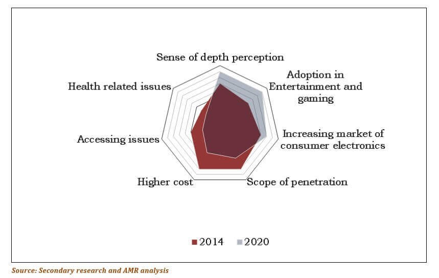 The two significant factors influencing this market are a sense of depth perception and the adoption in entertainment and gaming industry. These are the key factors that have led to the adoption of 3D display market. Along with the above-mentioned factors, the market is also dependent on the increase in scope of consumer electronics and 3D display market penetration. All these factors mutually create opportunities for market growth. Factors such as higher cost, accessing issues and health related issues limit the adoption of 3D display. However, each factor could have a definite impact on the market.