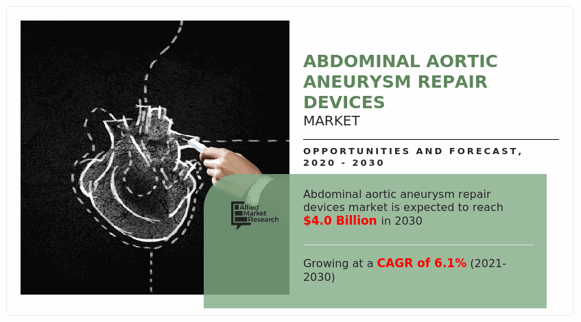 The global abdominal aortic aneurysm (aaa) repair devices market size was valued at $2,224.60 million in 2020, and is projected to reach $4,002.50 million by 2030, growing at a CAGR of 6.1% from 2021 to 2030. An abnormal expansion is an enlargement of the abdominal aorta, most often the infrarenal and aorto-iliac arteries, known as an abdominal aortic aneurysm (AAA). AAA can be life threatening if it bursts. It is most common in people who smoke. Aneurysms which are large or grows quickly should be cured with surgery.