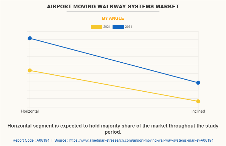 The airport moving walkway systems market is divided into horizontal and inclined. Horizontal moving walkways are installed at the ground level. These types of walkways are generally used for heavy transportation of travelers or luggage. Inclined moving walkways are inclined and generally installed across the floors. These type of walkways are generally inclined between the ranges of 10° to 12°. Further, the maximum height rise ranges from 5 meters to 8 meters vertically from the ground. Inclined walkways are little expensive to install and operate compared to horizontal walkways. Horizontal segment is expected to exhibit the largest revenue share in the angle segment in the airport moving walkway systems market during the forecast period. The inclined segment is expected to exhibit the largest CAGR during the forecast period.