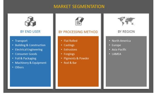 Aluminium market is segmented based on end user, processing method, and geography. On the basis of end user, the market is categorized into transport, building & construction, electrical engineering, consumer goods, foil & packaging, machinery & equipment, and others (solar panel nanotechnology and aluminium air batteries). According to processing, the market is divided into flat rolled, castings, extrusions, forgings, pigments & powder, and rod & bar. Geographical breakdown and deep analysis of each of the aforesaid segments is included for North America, Europe, Asia-Pacific, and LAMEA.