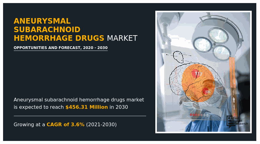 The global aneurysmal subarachnoid hemorrhage drugs market size was valued at $323.51 million in 2020, and is projected to reach $456.31 million by 2030, growing at a CAGR of 3.6% from 2021 to 2030. Aneurysmal subarachnoid hemorrhage (aSAH) is a life-threatening type of stroke caused by bleeding in the area around the brain. The major factors that drive the growth of the global aSAH drugs market include surge in geriatric population and increase in population suffering from hypertension. Furthermore, lifestyle changes such as alcohol consumption and smoking increase risk of aSAH, which, in turn, propel the market growth.