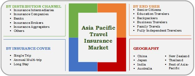 The Asia-Pacific travel insurance market is segmented based on distribution channel, insurance cover, end user, and geography. The distribution channel is categorized into insurance intermediaries, insurance companies, banks, insurance brokers, insurance aggregators, and others. For insurance cover, the market is divided into single trip, annual multi-trip, and long stay. Based on end user, it is classified into senior citizens, educational travelers, backpackers, business travelers, family travelers, and fully independent travelers. Geographically, it is analyzed across China, Japan, India, Australia, New Zealand, Thailand, and rest of Asia-Pacific.