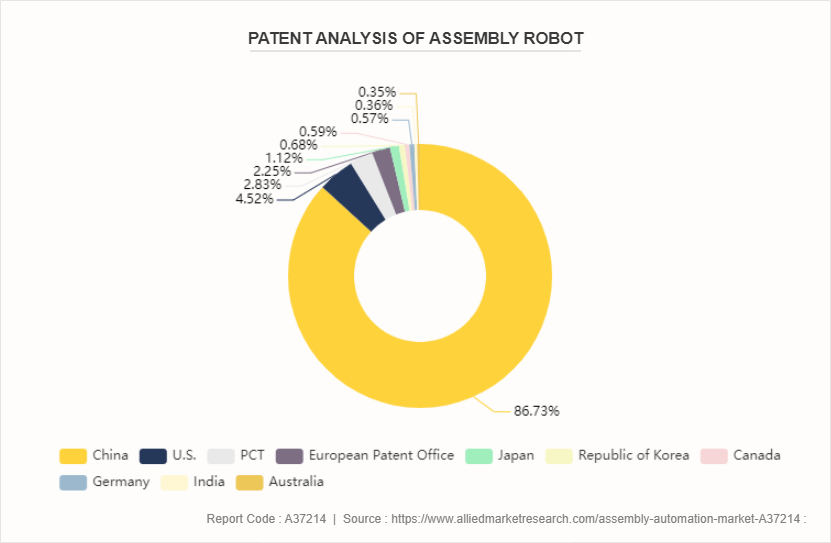The market is analyzed according to the patents filed by China, U.S., PCT, European Patent Office, Japan, Republic of Korea, Canada, Germany, India, and Australia. Approvals from these patent holders are followed by high adoption of assembly robots and initiatives associated with enhancing assembly line production at regional and global level. Therefore, these countries have the maximum number of patent filings.