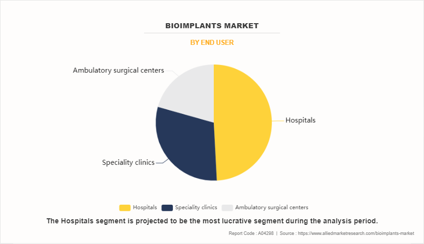 The bioimplants market is segmented on the basis of type, end user, and region. By type the market is divided into cardiovascular bioimplants, dental bioimplants, orthopedic bioimplants, spinal bioimplants, ophthalmology bioimplants, other bioimplants. By end user, the market is classified into hospital, specialized clinics, and ambulatory surgical centers.