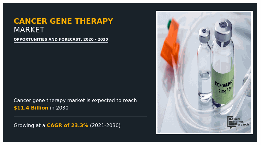 The global Cancer Gene Therapy Market size was valued at $1.4 billion in 2020 and is projected to reach $11.4 billion by 2030, growing at a CAGR of 23.3% from 2021 to 2030. Cancer is a group of diseases involving abnormal cell growth with the potential to invade or spread to other parts of the body. Cancer often has the ability to spread throughout your body. It is the second-leading cause of death in the world. Cancer gene therapy is a technique used for the treatment of cancer where therapeutic DNA is being introduced into the gene of the patient with cancer. Owing to the high success rate during the preclinical and clinical trials, cancer gene therapy has gained popularity. There are many techniques used for cancer gene therapy, for example, a procedure where the mutated gene is being replaced with a healthy gene or the inactivation of a gene whose function is abnormal. Recently, a new technique has been developed, where new genes are introduced into the body to help fight against cancer cells.