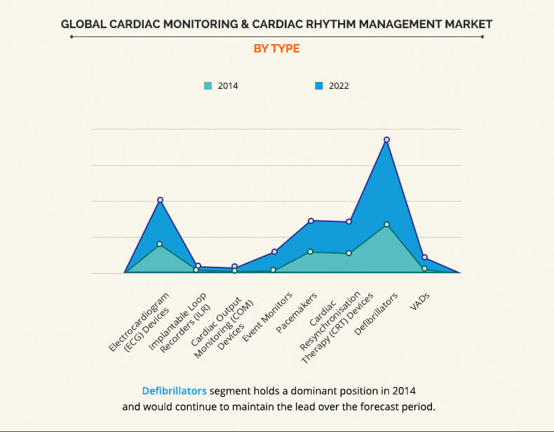 Global Cardiac Monitoring & Cardiac Rhythm Management Market size was valued at $19,397 million in 2015 and is expected to reach $32,216 million by 2022, growing at a CAGR of 7.6%. The volume market is poised to grow at a CAGR of 13.6% from 2016 to 2022. Cardiac monitoring (CM) devices help in continuous examination of a patient’s cardiac activity. Cardiac rhythm management (CRM) devices maintain normal cardiac rhythm in patients suffering from rate and rhythm disorders of the heart. These devices play a crucial role in the treatment of serious cardiac disorders, including heart failure, atrial fibrillation, atrial flutter, indications of recent heart attack, coronary ischemia, lack of oxygen supply to cardiac muscles, effects of drugs, and certain genetic errors among others.