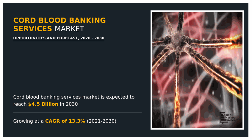 The global cord blood banking services market size was valued at $1.3 billion in 2020, and is projected to reach $4.5 billion by 2030, growing at a CAGR of 13.3% from 2021 to 2030. Cord blood contains a rich source of stem cells, which can treat more than 80 genetic diseases. Cord blood stem cells can treat chronic diseases such as cancer, diabetes, blood diseases, and immune diseases. Although, only a small amount of cord blood can be collected from a single umbilical cord, it contains large number of stem cells and is the only type of stem cell stored for future use. These cells are collected from hospitals & nursing homes and stored in cord blood banks for future use and can be stored for an average of 20-25 years. Government authorities have supported research and clinical trials of cord blood stem cells, thus increasing the interest of healthcare companies to invest in research and commercialization of cord blood stem cell therapies. The cord blood banking services market forecast from 2020 to 2030.