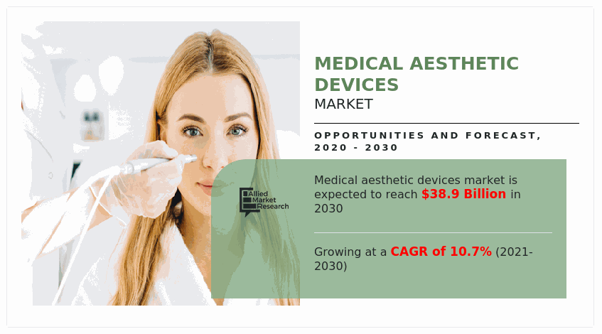 The global medical aesthetic devices market was valued at $13,529.65 million in 2020, and is projected to reach $38,916.60 million by 2030, growing at a CAGR of 10.7% from 2021 to 2030. Medical aesthetic is used to treat and enhance the aesthetic appearance of a person by treating various conditions, such as skin laxity, excessive fat, cellulite, scars, moles, wrinkles, unwanted hair, liver spots, spider veins, and skin discoloration. Traditionally, it includes dermatology, oral & maxillofacial surgery, reconstructive surgery, and plastic surgery. Aesthetic medicine comprises surgical & non-surgical procedures and a combination of both can be used to enhance the physical appearance of an individual. In addition, deformities caused due to accidents, trauma, and other congenital disorders are rectified by the use of aesthetic devices (particularly implants). In addition, aesthetic procedures help reverse the ageing process to a certain extent. Moreover, the importance of physical appeal is on rise and people globally are attracted to products and treatments that will help them retain their youth and beauty.