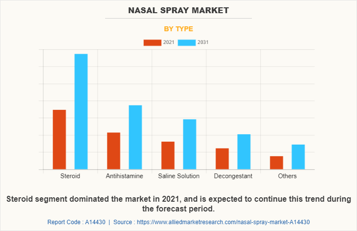 In addition, the geriatric population is more susceptible to nasal allergies and other respiratory disorders. Thus, the increase in geriatric population boosts the growth of the market. For instance, according to Population Reference Bureau, in 2019, regions such as Asia and Europe were home to some of the world's oldest populations reporting to 28 % (Japan) and (Italy) 23% of the total population. Thus, increase in the prevalence of nasal disorders is driving the growth during nasal spray market forecast by creating a greater demand for the effective treatments.