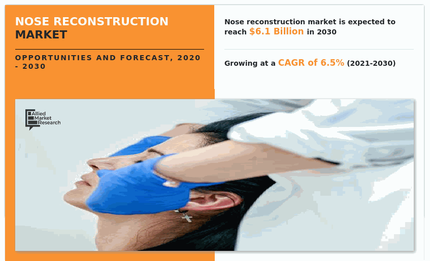 The global nose reconstruction market was valued at $3.3 billion in 2020, and is projected to reach $6.1 billion by 2030, growing at a CAGR of 6.5% from 2021 to 2030. Nose reconstruction is a method of changing the shape of the nose through surgical procedures to enhance the appearance and beauty of a person. Nose reconstruction surgery is also known as rhinoplasty. Nose reconstruction surgeries are mainly categorized as open rhinoplasty and closed rhinoplasty. Rhinoplasty is done to change the size, shape, or proportions of the nose. It may be done to repair deformities from an injury, correct a birth defect, or improve some breathing difficulties.