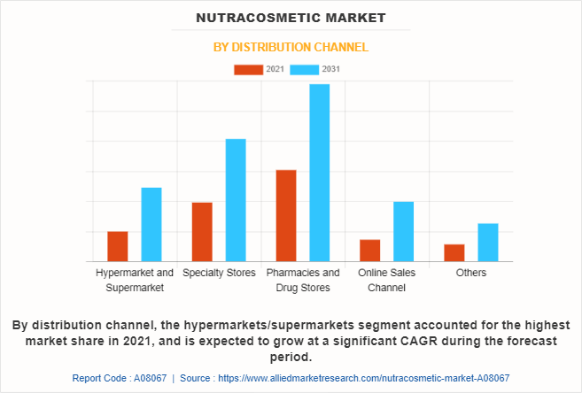By distribution channel, the market is divided into hypermarkets/supermarkets, specialty stores, pharmacies & drug stores, online sales channels, and others. The hypermarkets/supermarkets segment accounted for the highest market share in 2021, and is expected to grow at a significant CAGR during the forecast period. The increase in urbanization, rise in working class population, and competitive pricing boosts popularity of hypermarkets in developed and developing regions. Furthermore, these stores offer a variety of brands in a particular product category, offering more options for consumers to buy nutricosmetics products of their choice.