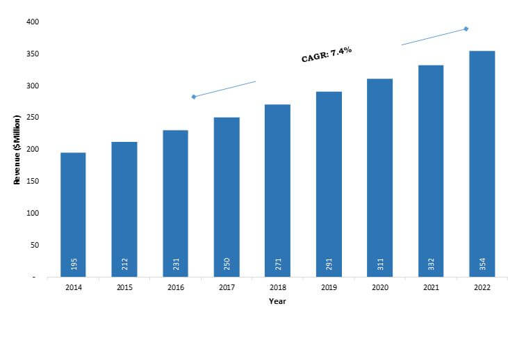 Brazil Optical Coating Market, 2014-2022 ($Million)