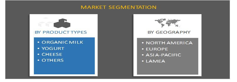 The global organic diary food and drinks market is segmented on the basis of product type and geography. Based on product type, of the market is divided into organic milk, yogurt, cheese, and others. The market is analyzed based on four regions, namely North America, Europe, Asia-Pacific, and LAMEA.
