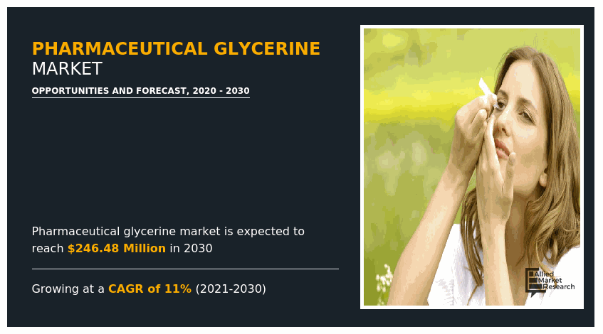 The global pharmaceutical glycerine market size was valued at $89.89 million in 2020, and is projected to reach $246.48 million by 2030, growing at a CAGR of 11% from 2021 to 2030. The total volume of global pharmaceutical glycerin market was 132,000 tons in 2020, and is projected to reach 243,641 tons by 2030, registering a CAGR of 6.6% from 2021 to 2030. Pharmaceutical glycerin is an organic compound known as glycerol and glycerin, and is majorly used as an excipient in the pharmaceutical industry. Glycerin exhibits various benefits in medical and pharmaceutical preparations such as improving smoothness, lubrication, and humectant. It is most commonly utilized in formulation of suppositories, cough syrups, elixirs, and expectorants.