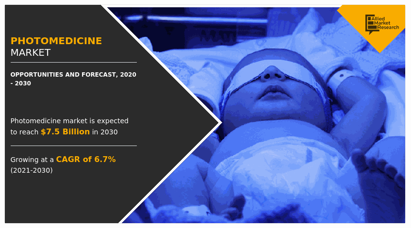 The global photomedicine market was valued at $4,047.64 million in 2020, and is projected to reach $7,510.35 million by 2030, growing at a CAGR of 6.7% from 2021 to 2030. Photomedicine is a branch of science that involves the study of light and its therapeutic application in the healthcare sector. The disease can be diagnosed and treated with the phototherapy technique by exposing the affected area to light with precise wavelengths. Various diagnostic and therapeutic methods in photomedicine employ endogenous or exogenous agents; photosensitizers that boost tissue absorption in a specific wavelength band and may significantly expedite photothermal or photochemical therapies. Phototherapy employs a variety of light sources, including lasers, polychromatic polarized light, full spectrum light, dichroic lamps, light emitting diodes (LED), fluorescent lamps, and others. It can be applied in the practice of dermatology, surgery, interventional radiology, optical diagnostics, cardiology, circadian rhythm sleep disorders, and cancer.
