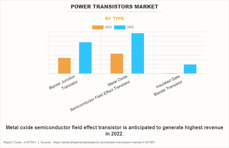On the basis of type, the market is divided into bipolar junction transistors, metal oxide semiconductor field effect transistors, and insulated gate bipolar transistors. In 2022, the metal oxide semiconductor field effect transistor segment dominated the market, and insulated gate bipolar transistor is expected to grow at a significant CAGR from 2023 to 2032.