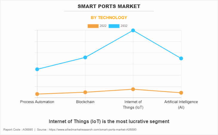 In 2022, the Internet of Things (IoT) segment was the largest revenue generator, and is anticipated to grow at a CAGR of 23.2% during the forecast period. IoT sensors attached to containers, vehicles, and cargo allow real-time tracking and monitoring of their movements within the port premises and throughout the supply chain. This provides better visibility into cargo status, location, and condition, facilitating more efficient logistics operations. IoT sensors are deployed on port equipment, such as cranes, trucks, and handling machinery, to monitor their performance, health, and usage. Real-time data helps in predictive maintenance, reducing downtime, and optimizing equipment utilization. These factors altogether may surge the adoption of IoT technology in the smart ports market.