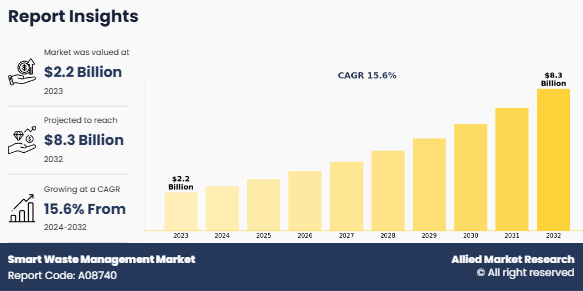 The smart waste management market was valued at $2.2 billion in 2023 and is estimated to reach $8.3 billion by 2032, exhibiting a CAGR of 15.6% from 2024 to 2032.