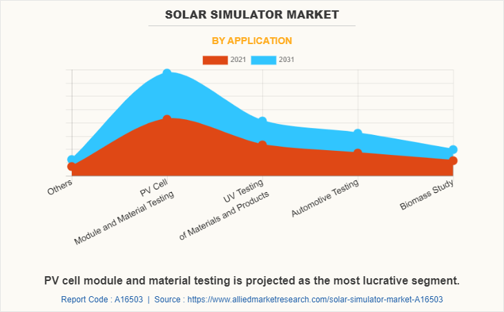 On the basis of light source, the xenon arc lamp segment holds the largest share, in terms of revenue, and is expected to maintain its dominance during the solar simulator market forecast period. This growth is attributed to rise in demand for xenon arc lamp based solar simulator owing to its ability to produce stable spectral equal to the sunlight without filtering from various applications including testing of PV cell or module applications. In addition, increase in use of xenon arc lamp based solar simulator owing to advantages associated with it such as good match to sunlight spectrum, stable spectrum, ability to produce high intensity beams and others, is expected to fuel the growth of the xenon arc lamp based solar simulator market in the coming years.