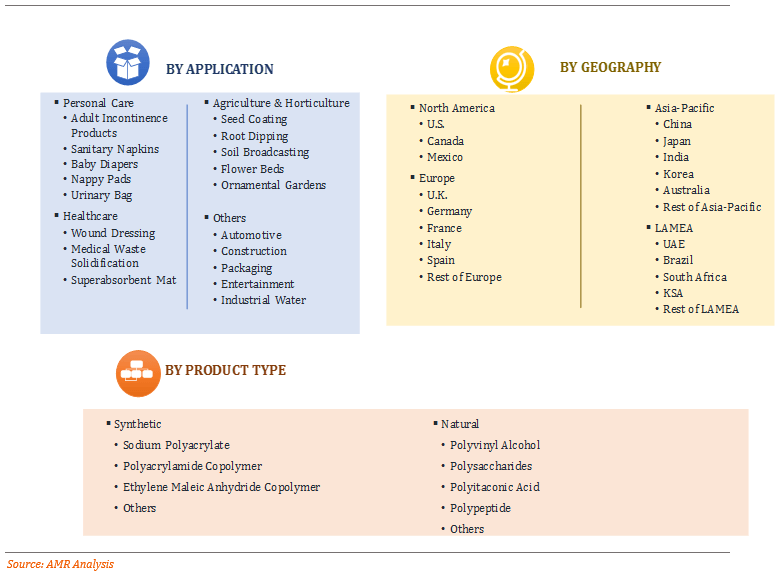 The global super absorbent polymers market is segmented based on type, application, production method, and geography. Based on type, the market is categorized into synthetic and natural, in which synthetic is subdivided into sodium polyacrylate, polyacrylamide copolymer, ethylene maleic anhydride copolymer & others and natural is subdivided into polyvinyl alcohol, polysaccharides, polyitaconic acid, polypeptide, & others. As per application, the market is divided into personal care, healthcare, agriculture & horticulture, and others (automotive, construction, packaging, entertainment, industrial water, & more). Geographically, it is analyzed across North America, Europe, Asia-Pacific, and LAMEA.