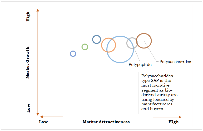 Polysaccharide, a natural super absorbent polymer, is the most attractive type for investment in the market due to increase in focus of manufacturers on bio-based super absorbent polymers and growth in awareness among consumers. Polysaccharides are the least expensive and most abundant available renewable organic material.