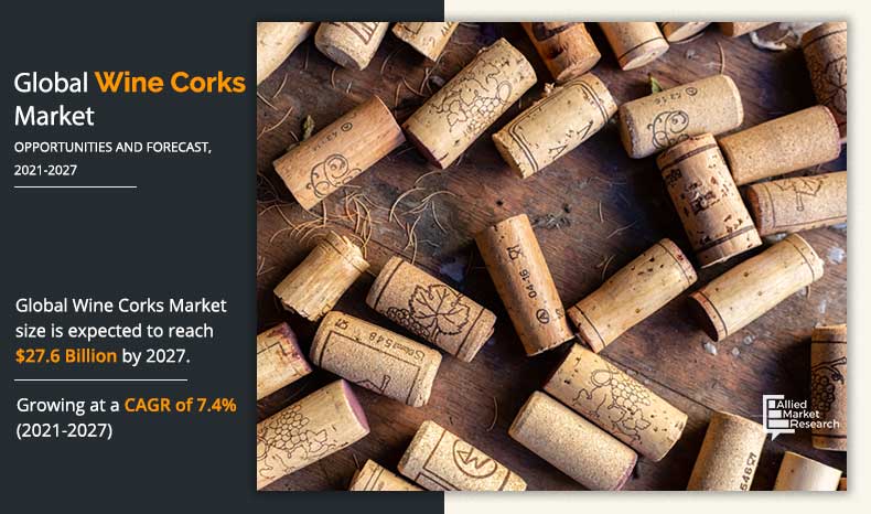 The wine corks market size was valued at $20.8 billion in 2019, and is projected to reach $27.6 billion by 2027, growing at a CAGR of 7.4% from 2021 to 2027.Wine corks or wine stoppers are a chunk made up of cork, rubber, or other similar products made by various materials used as a stopper for a wine bottle. These are mainly used to control the physical and chemical properties of the wines. Common wine corks control the moisture, act as resistance to spillage, and also control the oxidants that in turn control the presence of microorganisms. Various types of wine corks, such as natural, synthetic, screw caps, plastic caps, and others, are available in the market. Natural wine corks are best suited for the old and premium wine, which avoids leakage and extraction of flavors from the bottle.